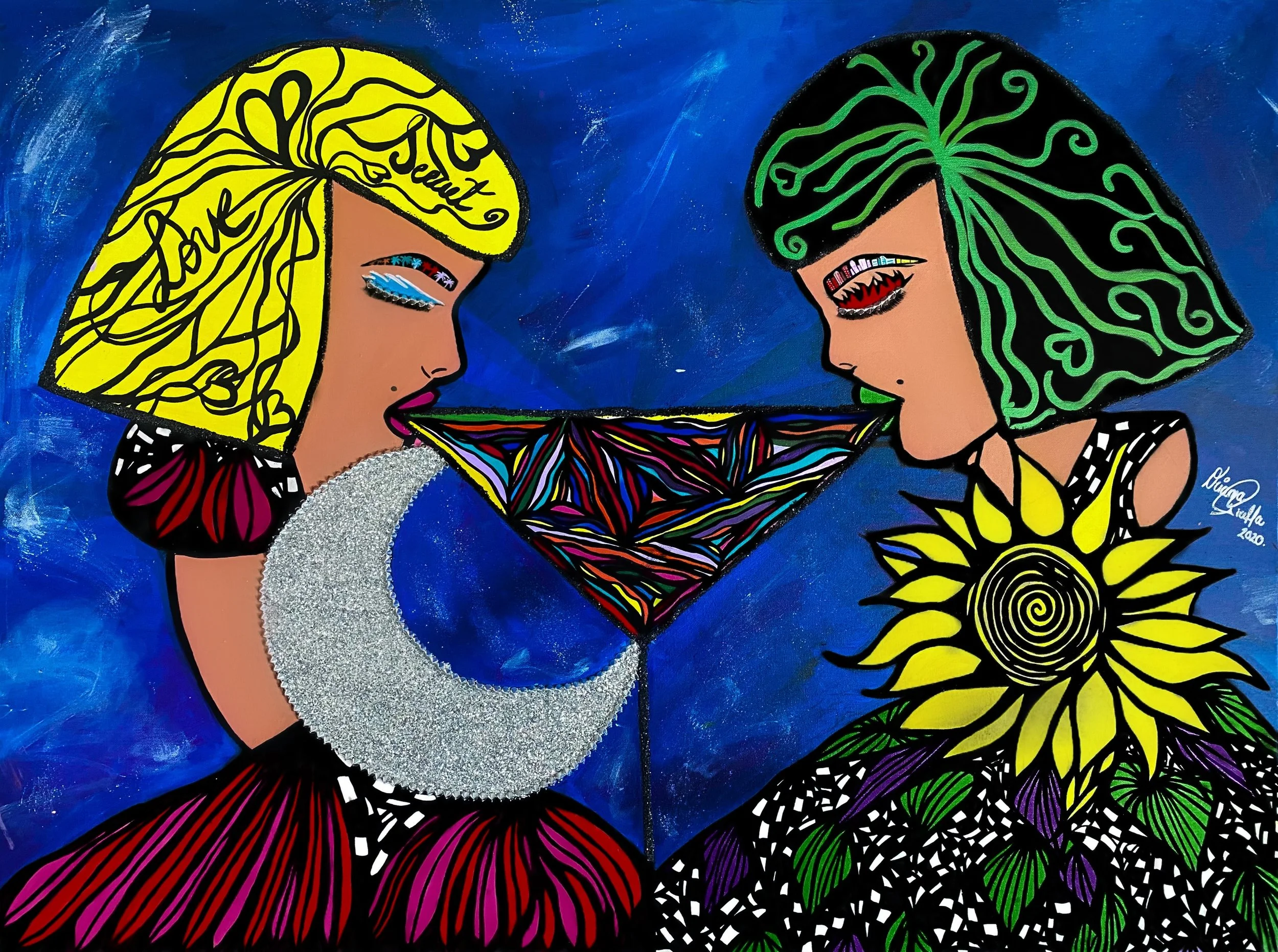 In this piece, I explore the journey to finding balance—the constant dance between light and darkness that exists within us all. The two mirrored figures represent the duality we carry inside, connected by the moon and sun, symbols of opposing forces in perfect harmony. The martini glass between them serves as a bridge, a delicate reminder that balance is something we create, not something we find.